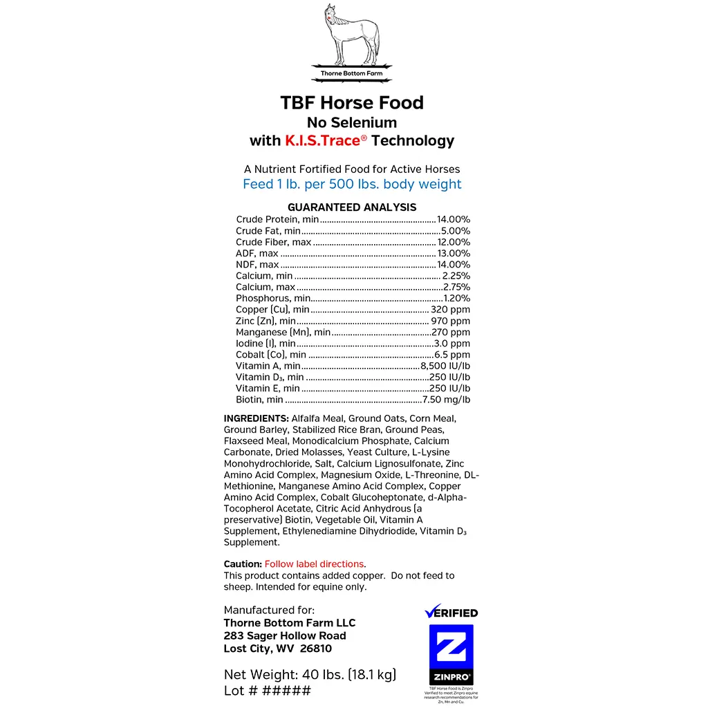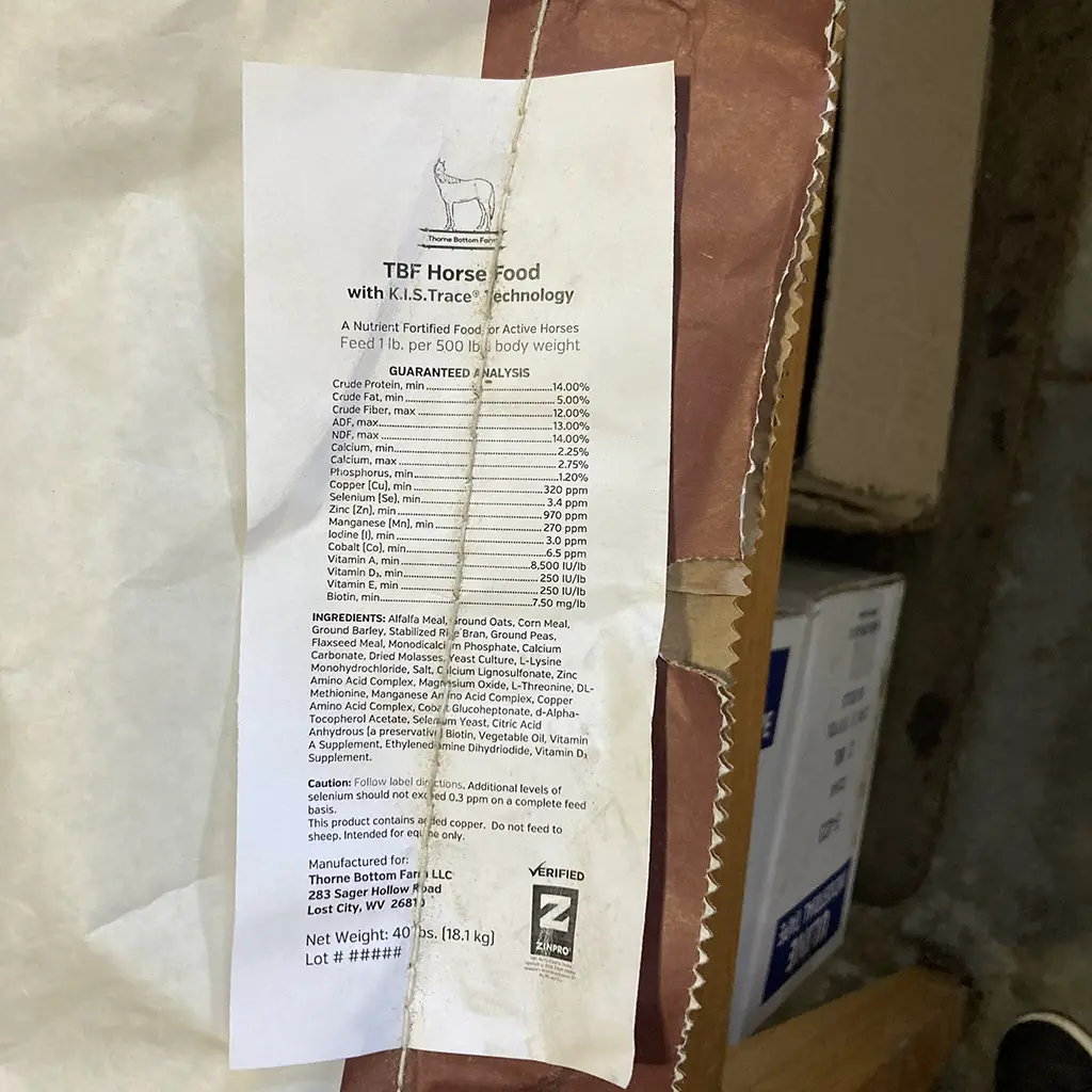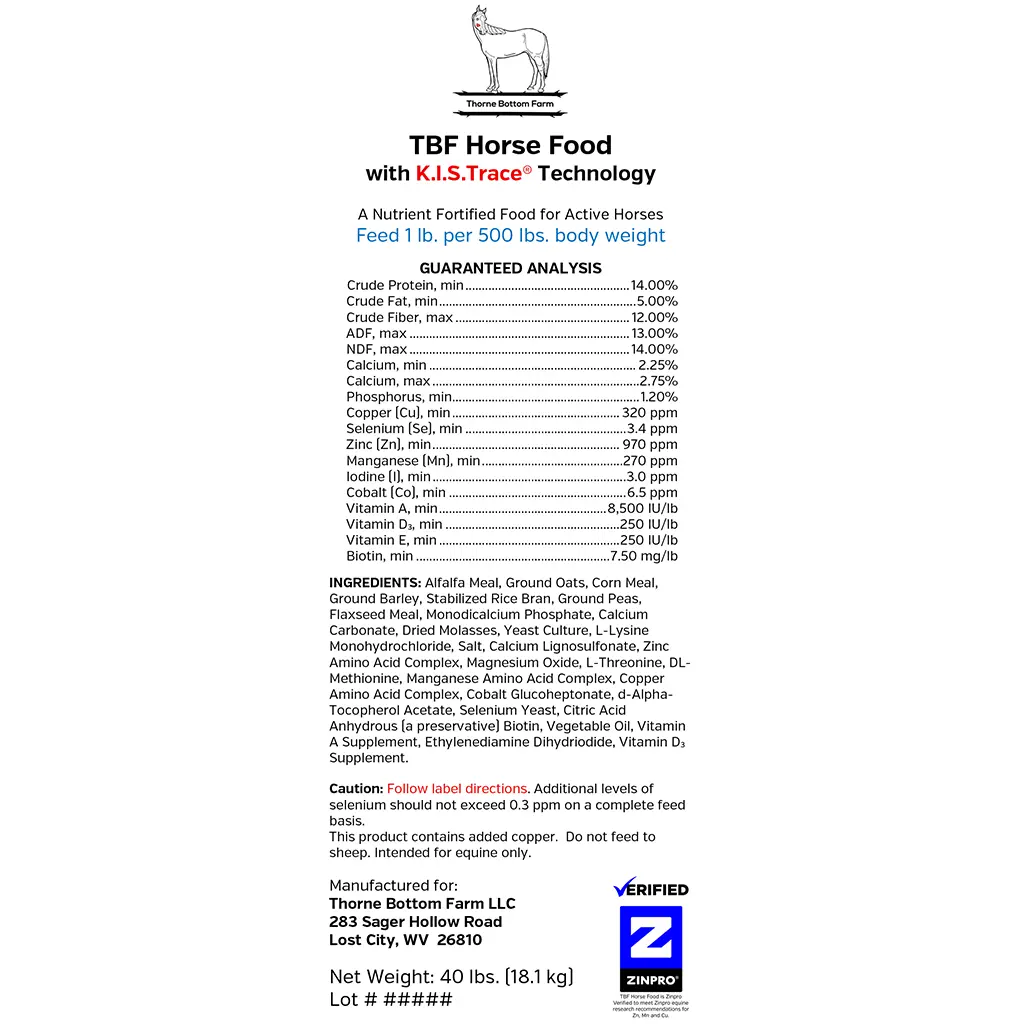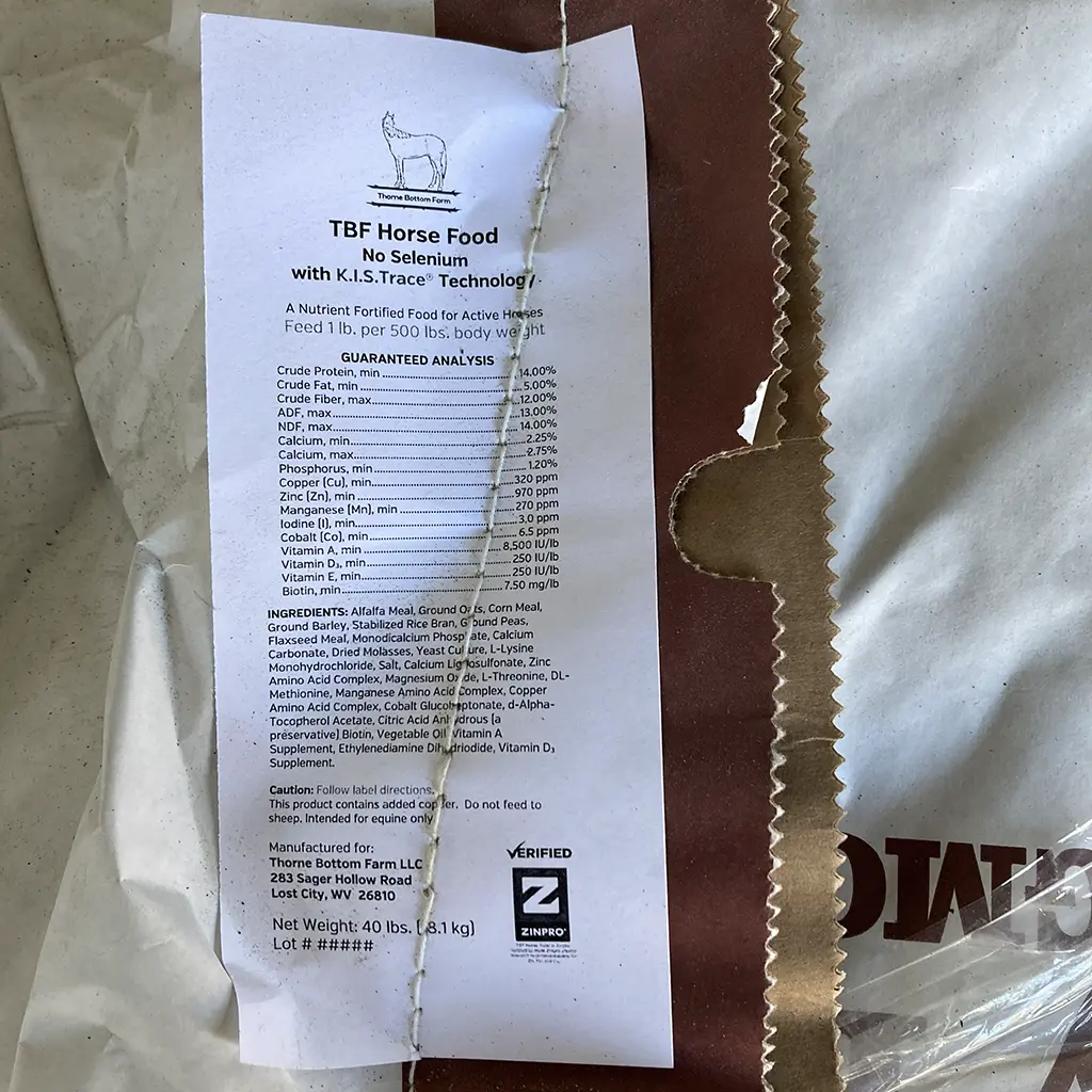 TBF Horse food is a real food, with zero by-products such as beet pulp, wheat middlings or soy hulls. 12% Fiber comes from oat and barley hulls and other gut friendly ingredients.